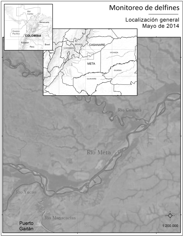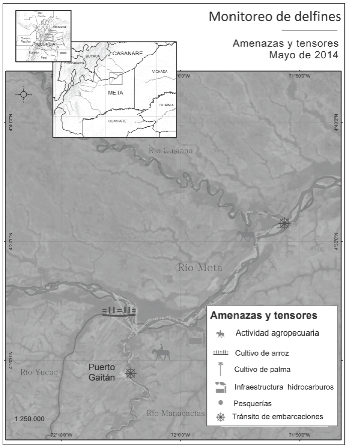 INTRODUCTION: As a consequence of population isolation by the presence of geomorphological barriers, dolphins from northern South America are subdivided into three species: I. geoffrensis (Amazon and Orinoco Rivers), I. boliviensis (Madeira River in Bolivia), and the recently described I. araguaiaensis inhabiting the hydrologic complex of the Araguaia -Tocantins Rivers in the northeastern Brazilian Amazon. The importance of pink dolphins at the ecosystems they inhabit is supported by: 1) its position as top predators in the food chain; 2) bioindicators for ecosystem health; 3) its cultural and mythological meaning for the local ethnic groups, such as Sikuanis from the Orinoco, and Ticuna for the Amazon; and 4) their economic value, mainly as a touristic attraction. The conservation status of Orinoquian populations of river dolphins (i. g. humboldtiana), has not been fully established. However, we know their populations are threatened by a series of human activities on both aquatic and terrestrial environments, affecting their occurrence across the basin. This research is part of an inter-institutional effort conducted between the Corporación para el Desarrollo Sostenible del Área de Manejo Especial de la Macarena (CORMACARENA) and Fundación Omacha, to monitor pink dolphin populations inhabiting the rivers: Meta, Manacacías, Yucao, and Cusiana, in order to identify conservation tensors affecting the species in the study area.