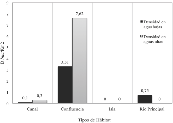 La variación de las densidades de la especie durante los periodos de estudio se dio en función del tipo de hábitat: Confluencia D = 3.3 - 7.62 Inia/Km2, Río Principal D = 0.75 - 1.5 Inia/Km2 y Canal D = 0.1 - 0.30 Inia/Km2. En el tipo de hábitat Isla, no se registraron observaciones (Figura 3 y Tabla 7).