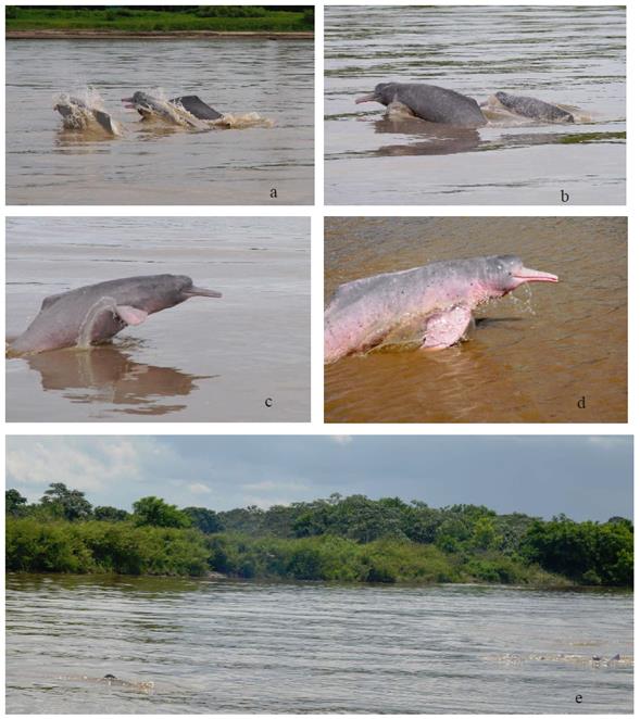 Este estudio permitió identificar las confluencias entre los ríos Manacacías-Yucao, y Meta y Cusiana-Meta, como zonas de una alta productividad en relación con el recurso pesquero durante los diferentes periodos hidrológicos estudiados. Por lo tanto, se proponen como zonas prioritarias para la conservación de la especie, dada su importancia ecológica al presentar los mayores valores de densidades en los tipos de hábitat evaluados. Esto coincide con lo expuesto por Trujillo y Diazgranados (2004), y con Gómez-Salazar et al. (2011), quienes relacionan el mayor número de individuos en las confluencias en los río Meta y Orinoco (Figura 4). Posiblemente allí puedan presentarse conflictos con pesquerías por un recurso pesquero cada vez más escaso. La información obtenida permitió establecer la importancia de estas áreas como fuente de alimentación debido al encuentro de aguas y al paso obligado para la mayoría de los peces que realizan migraciones entre los ríos y sus tributarios. Estos lugares se convierten en algunos de los más preferidos por los delfines en sus actividades de alimentación (Smith, 1993; Trujillo, 2000; Trujillo et al. 2008). Asimismo, Trujillo y Diazgranados (2004) sugieren que haya esfuerzos de conservación en las confluencias. De esta forma, se garantizaría la presencia de los delfines y también de las especies que se encuentran asociadas a estos sistemas. Este estudio, junto con otros realizados anteriormente, sugiere que las confluencias (ríos Meta-Manacacías y Yucao / Cusiana-Meta) constituyen los hábitats más importantespara I. geoffrensis en la cuenca del río Meta. En dichos lugares ocurren algunas actividades muy importantes para los delfines, como la alimentación, la socialización, la reproducción y la crianza (Figura 5).