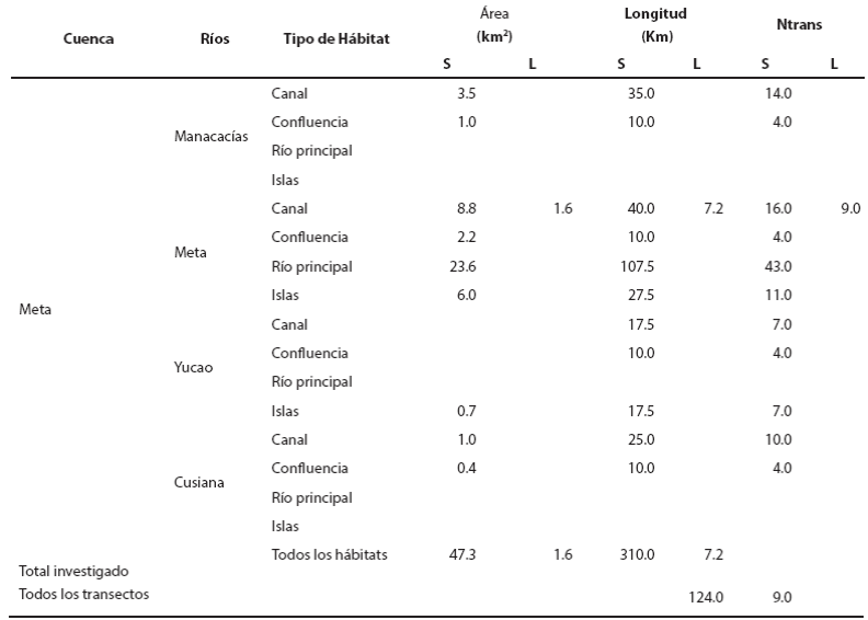 Diseño de los transectos. Se establecieron cuatro tipos de hábitats con base en las conductas etológicas establecidas para los delfines de río y en criterios limnológicos para la cuenca, como a) río principal, b) confluencias, c) canales, y d) islas. El diseño de muestreo para los tipos de hábitat establecidos empleó una combinación de transectos en banda (paralelos a la orilla que mantenían una distancia de 150 m) y transectos lineales (en un ángulo de 45˚ respecto de la orilla; Gómez-Salazar et al. 2011). Los transectos en banda se realizaron en todos los tipos de hábitat y los transectos en línea solo se realizaron en el río principal. En el caso de los tipos de hábitat donde el ancho es menor a 400 m, se tomó la distancia a cada lado de la orilla. Se diligenció una planilla de esfuerzo de muestreo, donde se registraron los datos de distancia de los transectos, coordenadas de la zona y tipos de eventos (observaciones y amenazas de origen antrópico).