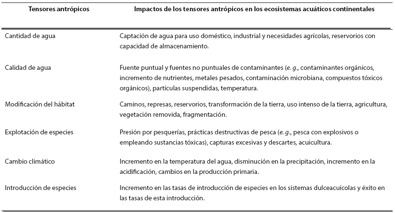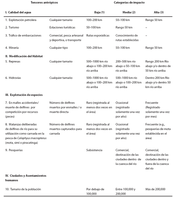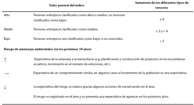 Tensores antrópicos y valoración del índice de degradación de ecosistemas de agua dulce. El índice de degradación para ecosistemas lóticos fue desarrollado por Gómez-Salazar et al. (2012) y considera diez tensores antrópicos (Tablas 2 y 3), agrupados en cuatro categorías: I) calidad del agua, II) modificación del hábitat, III) explotación de especies y IV) asentamientos humanos y ciudades. Cada tensor fue categorizado con valores de 0 a 3 de acuerdo con los cuatro tipos de impactos considerados: (0) cuando el disturbio es ausente/ no hay disturbio, (1) cuando el disturbio es bajo, (2) medio y (3) alto (Tabla 4). El valor del índice para las categorías (calidad del agua) es (I), modificación del hábitat; (II) y explotación de especies (III; Tabla 3). A continuación, se calculó el valor promedio de estos tensores para ser considerados en el valor general del índice, obtenido por medio de la sumatoria de los valores resultantes para las tres categorías evaluadas (Tabla 4). Se estableció el valor general del índice en el rango entre 0 y 8.5 (8.5 consiste en una alta degradación). La información relacionada con el tamaño de la población (asentamientos humanos y ciudades, IV; Tabla 4). En el área de estudio en la cuenca media del río Meta se obtuvo usando bases de datos del censo de la población en las localidades asentadas sobre la cuenca del Meta (Tabla 4, DANE 2005). Las amenazas en un futuro de los ecosistemas dulceacuícolas continentales para cada tensor antrópico se establecieron mediante el conocimiento y las experiencias adquiridas a través del trabajo de los investigadores en la región, y por el acceso a información como el desarrollo de proyectos sobre recursos hídricos en la cuenca (Tabla 4).