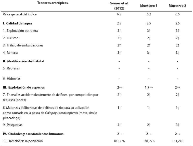 Tensores antrópicos y valoración del índice de degradación de ecosistemas de agua dulce. Se calculó el valor general del índice de degradación de un ecosistema acuático continental considerando la propuesta de Gómez et al. (2012), cuyos rangos se encuentran entre 0 y 8.5 (8.5 se ubica en una alta degradación). Se obtuvieron valores altos, entre 6.2 y 6.5, en los muestreos realizados, durante los meses de marzo (aguas bajas) y mayo (aguas altas) de 2014. Los resultados coinciden con lo expuesto por Gómez et al. (2012), quien reporta valores de 6.5 para el índice. Debe anotarse que la intensidad de estos tensores antrópicos presenta un comportamiento diferencial entre los dos periodos hidrológicos. Se incrementa su impacto durante el periodo de aguas altas en la categoría de explotación de especies, específicamente en la actividad de pesquerías. Lo anterior se debe al incremento de dicha actividad, estimulada por los procesos de migraciones reproductivas de la fauna íctica, generados a su vez por las precipitaciones, en las que se implementan artes de pesca, como redes y trasmallos, que aumentan la probabilidad de capturas incidentales de estos cetáceos. En relación con el periodo de aguas altas, se incrementan actividades como el tráfico de embarcación y la actividad pesquera (Tabla 5).