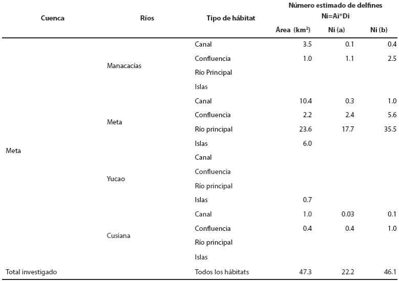 Tamaño de la población: El tamaño de la población de delfines de río (Ni) para cada hábitat i fue calculado por Ni = AiDi.