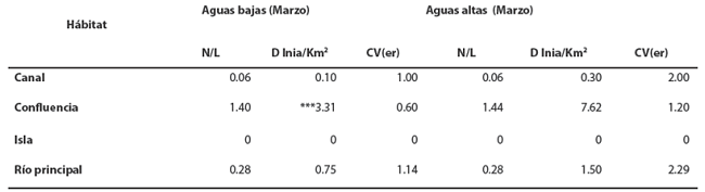 Los resultados durante el periodo de aguas altas coinciden con lo expuesto por Gómez-Salazar et al. (2011). Se reportaron densidades de D = 9.92 Inia/Km2 en el tipo de hábitat Confluencia, río Principal D = 9.5 Inia/Km2 y Canal D = 3.16 Inia/Km2. Sin embargo, Gómez-Salazar et al. (2011) registra densidades de D = 1.24 Inia/Km2 en el tipo de hábitat Isla. Esta diferencia de resultados reportados en el tipo de hábitat Isla posiblemente se deba a una mayor área muestreada (Puerto Gaitán-Puerto Carreño) por Gómez-Salazar et al. (2011) en segmentos más anchos del río.