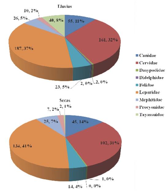 Se obtuvo un total de 826 registros independientes de 3,459 fotografías, con un esfuerzo total de muestreo de 3,300 cámaras-día. Los datos obtenidos con foto-trampeo y con métodos indirectos (huellas) para ambas épocas del año revelaron una riqueza específica de 16 especies compuestas por cinco órdenes (Didelphimorphia, Cingulata, Lagomorpha, Carnivora y Artiodactyla), nueve familias y 16 géneros. Los registros obtenidos con el foto-trampeo muestran que solo en cuatro familias (Leporidae, Cervidae, Canidae y Tayassuidae) se concentra 87 % de los registros obtenidos únicamente en la época de lluvias (Figura 2). En secas se mantiene un patrón similar, aunque la familia Tayassuidae se sustituye por la familia Mephitidae (Figura 2), ya que los pecaríes de collar no fueron registrados en la época de secas.