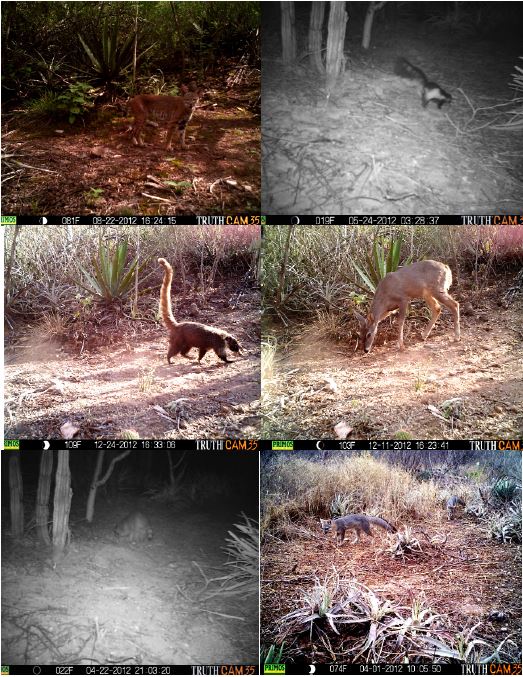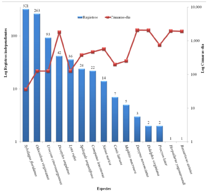RESULTADOS: Se realizó un esfuerzo de muestreo de 3,300 días-trampa. Se obtuvieron 826 registros independientes de 15 especies de mamíferos de talla mediana a grande. Adicionalmente, se registró al Puma concolor por medio de huellas. Solo una especie se encuentra bajo categoría de riesgo en la NOM-059-SEMARNAT-2010: Herpailurus yagouaroundi. Las especies con mayor abundancia relativa fueron Sylvilagus floridanus, Odocoileus virginianus, Urocyon cinereoargenteus y Dicotyles angulatus. Las de menor abundancia fueron Bassariscus astutus y Herpailurus yagouaroundi.
