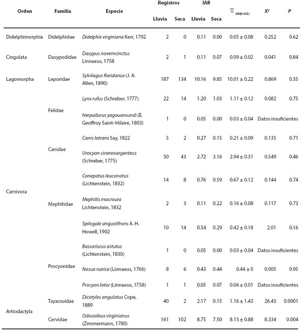 En cuanto a las abundancias relativas por especie y época, destacan los resultados obtenidos para el pecarí de collar (Dicotyles angulatus), que en época de lluvias fue más abundante que en secas (IAR = 2.17 y 40 registros independientes, IAR = 0.15 y 2 registros independientes, respectivamente). Las abundancias relativas fueron estadísticamente similares entre la época de lluvias y la de secas (t = 0.689, g. l. = 14, P = 0.49). No obstante, el análisis estadístico con la separación de cada una de las especies por época arrojó que existen diferencias significativas entre las abundancias estimadas solo para dos especies (P < 0.05): el pecarí de collar (D. angulatus, X2 = 26.43, g. l. = 1, P = 0.0001) y el venado cola blanca (O. virginianus, X2 = 8.334, g. l. = 1, P = 0.004; Tabla 1). El resto de las especies no tuvo diferencias significativas en las estimaciones de abundancia entre épocas, es decir, el patrón de los resultados se muestra similar tanto para lluvias como para secas.