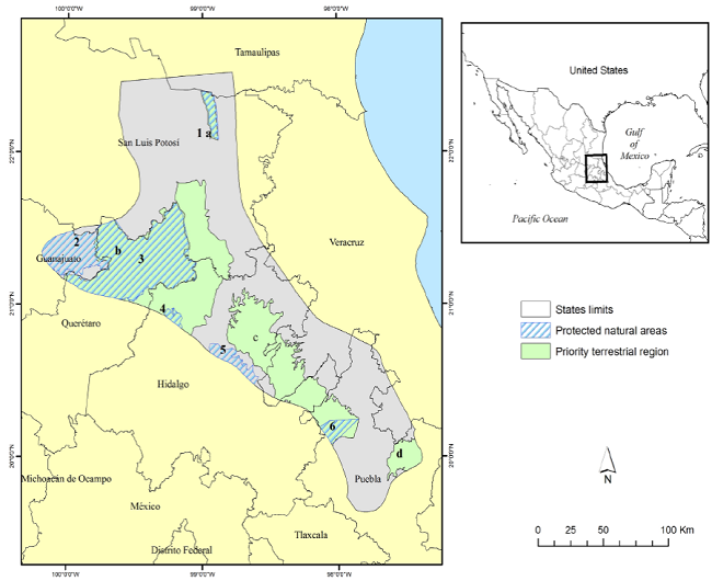 Our evaluation area was centered at 21° 4´ 46´´ N and -98° 47´ 8´´ W and included 30,837 km2 in the southern SMO. This region includes seven priority conservation areas that are managed under different categories (Ortega-Huerta and Peterson 2004). These areas include the Abra-Tanchipa Biosphere Reserve which harbors one of the most important jaguar populations in the SMO (Figure 1; Villordo-Galván et al. 2010).