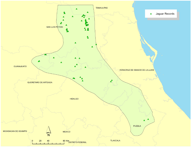 In addition to the existing data on each RTP, vertebrate studies in the SMO further indicate the presence of the main prey of the jaguar (Núñez et al. 2000; Rosas-Rosas et al. 2008) in San Luis Potosí (Ávila-Nájera et al. 2011; Rueda et al. 2013), Hidalgo (Sánchez-Rojas et al. 2009), and Puebla (Villarreal-Espino-Barros et al. 2008; Bravo et al. 2010). Because the distribution and movements of jaguars depend largely on the presence of food, these records further indicate the potential of the SMO to support the long-term needs and movements of the jaguar (González and Miller 2002).