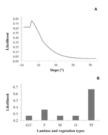We obtained and classified 68 jaguar locations (Rosas-Rosas et al. 2002; Villordo-Galván et al. 2010; Hernández Saint-Martin et al 2013; Hernández Saint-Martin et al. 2014; Martinez-Calderas, per. comm.) that met the Class I credibility criterion of Tewes and Everett (1986; Figure 3). Maximum entropy modeling indicated that distribution of jaguars in the SMO was most strongly associated with slope and land use-vegetation type (Table 1). The best supported model contained slope and land use-vegetation type and fit data well (AUC = 0.881; SE = 0.056; Concordance = 79 %); slope accounted for 53% of the proportional variance in the model and likelihood of jaguar presence was > 0.70 in areas with slope < approximately 9o, then decreased rapidly until likelihood of presence was < 0.50 with slopes > 11o. Land use-vegetation type accounted for 47 % of the proportional variance in the model; presence of jaguar was most strongly associated with tropical forest (Likelihood > 0.70; Figure 4). Collectively, jaguar presence was most likely in tropical and oak forests with moderate slope.