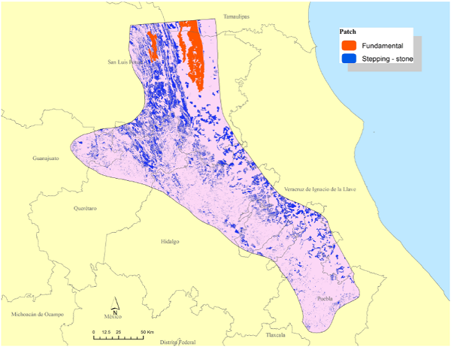 Implications. Biological corridors of the SMO initiate at fundamental patches in the States of Tamaulipas and San Luis Potosí, with continuity towards the State of Queretaro. In Queretaro, historic and present reports of jaguar presence and the presence of primary prey suggests that suitable habitat conditions exist to allow jaguars to meet their basic requirements (Téllez and López 1995). Although there are no historical or recent records of jaguars in Hidalgo, we identified routes that connect directly with the state of Puebla, with further possibilities of connection to northeastern Oaxaca where the presence of the jaguar was recently documented (Figures 7 and 8; Briones-Salas et al. 2012).