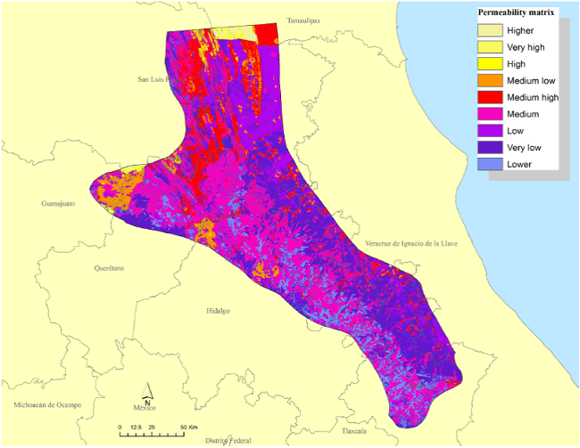 The resultant permeability matrix indicated that approximately 49 % and 3 % of the SMO constituted areas of medium and low resistance to jaguar movements, respectively (Figure 6). The remaining 48 % was characterized by attributes that probably represented a barrier for jaguar movements. Most of the areas of higher resistance and therefore the higher cost areas for jaguar movements were located in the western portion of the SMO (Figure 6).