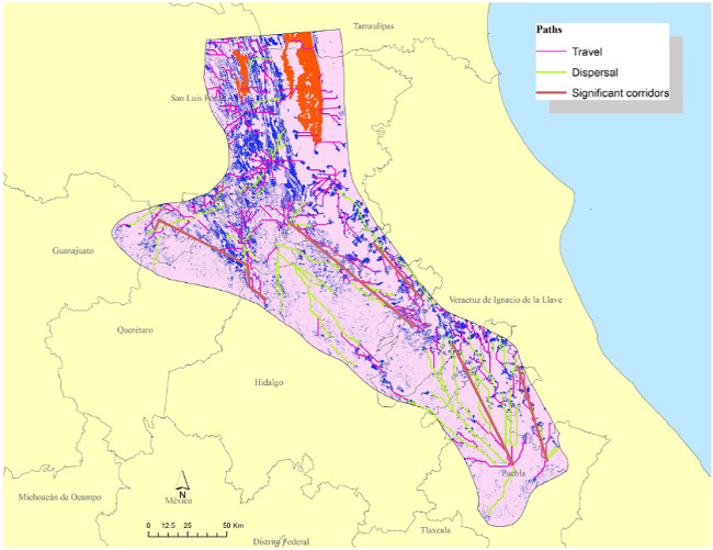Results of the LCP analysis showed 61 dispersal routes totaling > 2,000 km, and > 200 travel routes (Figure 7). The largest number of both route types was in Hidalgo (Table 4). Potentially significant movement corridors for jaguar in the SMO included: