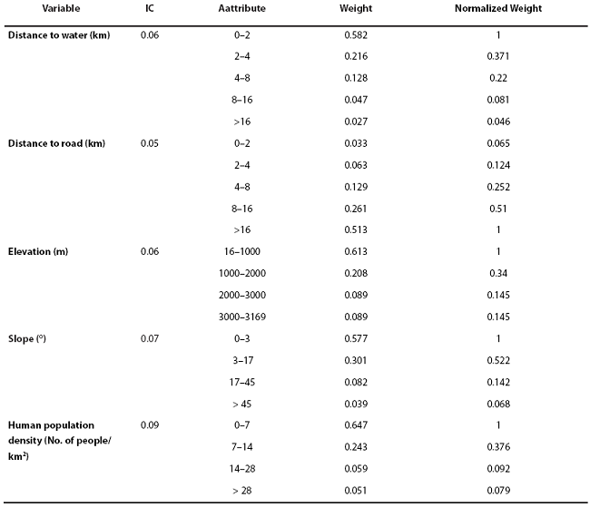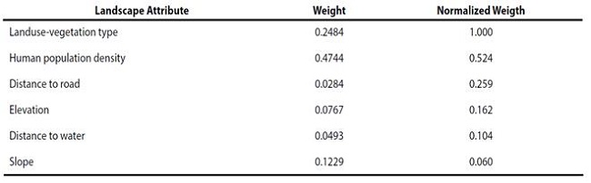 We surveyed 9 jaguar researchers from universities and research centers in Latin America for our AHP analysis. Results of surveys suggested that areas with population densities < 7 inhabitants/ km2; with slopes from 0 - 3°; elevations of > 1000 m; presence of permanent water within 2 km; and > 16 km from roads were the most likely to be used by jaguar. Further, tropical forests, oak forests, and tropical deciduous forests were considered the most suitable vegetation types for jaguar in the study area (Table 2). Respondents considered the type of land use- vegetation and the human population density to be the most important landscape characteristics associated with jaguar presence (Table 3).