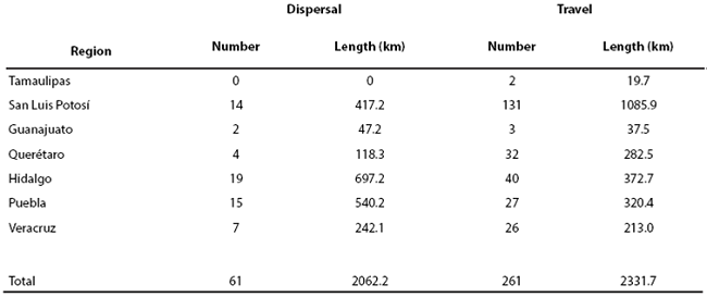 2. In the middle region, numerous dispersal routes originate in Hidalgo (e. g. in localities including Pisaflores, Chapulhuacan, Tlanchinol, Yahualica, San Felipe Orizatlan, Hujutla de Reyes, and Atlapexco, Huatla) providing for movement throughout Hidalgo and into other states, including a route towards Veracruz that passes through through Chiconamel.