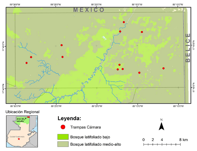 Descripción del financiamiento: A Wildlife Conservation Society, Programa para Guatemala, en especial a R. Balas McNab. A J. Soto, por permitirnos trabajar en este proyecto. Al Fondo Nacional de Ciencia y Tecnología, proyecto 118-06, otorgado por la Secretaria de Ciencia y Tecnología, Consejo Nacional de Ciencia y Tecnología, Programa de Paisajes Vivientes de WCS-Guatemala, y a IdeaWild, por el soporte financiero y la donación de equipo. Al Consejo Nacional de Áreas Protegidas, Instituto de Antropología e Historia, y a la Asociación Balam, por el apoyo y las facilidades brindadas. A los técnicos de campo de WCS-Guatemala, por toda su ayuda. A N. Estrada, por compartir los datos de su investigación. A R. Reyna-Hurtado, M. Briceño, por sus sugerencias y a N. Solís por la ayuda en la elaboración del mapa.