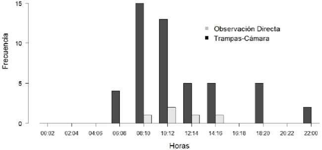 Patrones diarios de actividad en aguadas. A fin de considerar un registro como fotocaptura independiente, cada imagen de pecarí de labios blancos tuvo que ser tomada como mínimo cada 30 minutos (O'Brein et al. 2003; Bowkett et al. 2007). Posteriormente, se agruparon las fotografías y observaciones directas en el programa Excel de Microsoft(c) y se estimó la frecuencia de visitas a lo largo de 24 horas divididas en lapsos de dos horas (Cuellar y Noss 2003).