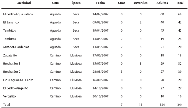 Tamaño y composición de grupos. Para registrar el tamaño y la composición de los grupos, fueron visitadas 12 aguadas entre las 8:00 h a 17:00 h, por un periodo de 10 días durante cada mes. Se abarcó la época seca comprendida entre de febrero a mayo de 2007. Además, durante la época lluviosa, entre junio y octubre de 2007, se realizaron conteos oportunos de grupos de pecaríes de labios blancos en caminos (Tabla 1). El tamaño y la composición de los grupos fueron obtenidos por medio de registros realizados tanto en aguadas como en caminos. Se abarcó la época seca y lluviosa (Tabla 1). Las observaciones en aguadas fueron realizadas en árboles a una altura aproximada de 4 m para contar el tamaño mínimo de los grupos. Las observaciones en caminos fueron realizadas cuando nos desplazábamos del campamento hacia las aguadas. En el momento de observar un grupo, se anotó la fecha, hora, número de crías, juveniles y adultos. Para identificar crías, juveniles y adultos, se utilizaron los siguientes criterios: las crías son de tamaño pequeño comparado con juveniles y adultos; su color es café claro y se desplazan junto a sus madres. Los juveniles presentan tamaños intermedios y son de color café claro negruzco. Los adultos son de color negro y presentan el mentón blanco (Sowls 1984, 1997).