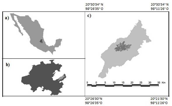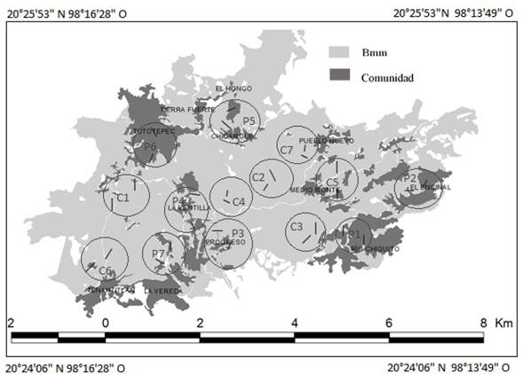 Área de estudio. El estudio se llevó a cabo en el bosque mesófilo de montaña (6,070.1 ha) del municipio de San Bartolo Tutotepec, Hidalgo, 20° 24' 50" N y -98° 14' 24" O México (Figura 1). Esta zona pertenece a la reserva de biósfera corredor biológico del bosque mesófilo de montaña y se caracteriza por ser uno de los BMM mejor conservados en el estado. Posee elevaciones que van de los 200 a 1,944 m, presenta una topografía accidentada, con pendientes pronunciadas y escarpadas y predominan los suelos de tipo regosol: calcárico, dístrico y eútrico (CONABIO 2010). Se presentan tres zonas climáticas, cálidas, semicálidas y templadas, con un rango de temperatura media anual de 12 a 18 °C y un rango de precipitación anual de 12 a 18 °C y un rango de precipitación anual de 1,200 a 2,000 mm (Villavicencio y Pérez-Escandón 2007). Las especies vegetales dominantes en la zona de estudio son Pinus teocote, Fagus grandifolia subsp. mexicana, Quercus xalapensis, Q. sartorii, Liquidambar styraciflua, Clethra macrophylla, Oreopanax xalapensis, Cyathea fulva y Dicksonia sellowiana en los fragmentos de bosque y en las zonas abiertas predominan Alnus acumminata y A. jorullensis.