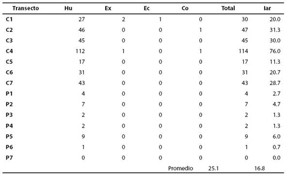 Se identificaron 352 registros de venado temazate con un esfuerzo de muestreo de 21 km lineales. El índice de abundancia relativa promedio fue de 16.76 rastros/km. Se encontraron registros en casi todos los transectos en franja, con excepción del P7, detectando tres zonas de mayor concentración en los sitios C2, C4 y C7 (Tabla 1). La mayoría de los registros se obtuvieron dentro de zonas forestales alejadas de manchas urbanas, incluso en los sitios con mayor porcentaje de deforestación.