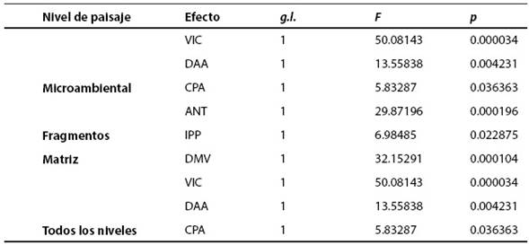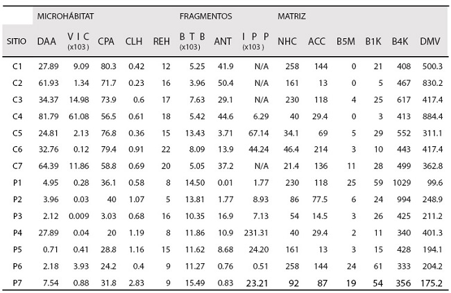 A partir de un análisis general entre los tres niveles de variables ambientales: microhábitat, fragmentos y matriz se registró que la variabilidad en la abundancia de rastros de venado temazate puede explicarse con tres variables principales: densidad absoluta de árboles, el valor de importancia de especies vegetales comestibles y la cobertura de protección para temazates adultos.