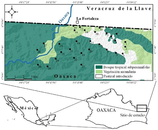 El trabajo se realizó dentro de los terrenos comunales de la congregación de La Fortaleza, Municipio de Santa María Chimalapa, en la región denominada como Los Chimalapas. Se ubica al sureste del estado de Oaxaca en la región del Istmo de Tehuantepec (17° 09´ 32.2" N, -94° 13´ 45.3" O). Limita al este con la Sierra del Espinazo del Diablo, al sur con la Sierra Atravesada, ambos en Oaxaca, al norte con Los Uxpanapas, Veracruz y al oeste con el río Oaxaca (Arriaga et al. 2000).