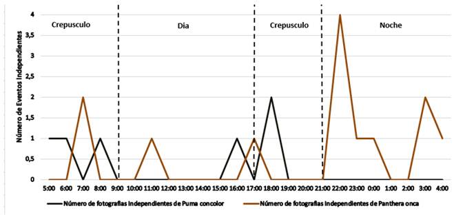 De acuerdo a Monroy-Vilchis et al. (2007), P. concolor tiene su pico de actividad durante el crepúsculo (matutino y vespertino), lo que coincide con nuestras observaciones. Por otro lado, a partir de 121 registros obtenidos en el Parque Nacional Kaa Iya en Bolivia (Maffei et al. 2007)) observaron a P. onca más activo durante el día, lo que contrasta con los datos aquí obtenidos. Sin embargo, coincide con lo reportado por Moreira et al. (2009), quien encontró que esta especie es principalmente nocturna en la Reserva de la Biosfera Maya, Petén, Guatemala. Los patrones de actividad de las principales presas potenciales: Cuniculus paca, Crax rubra, Dasypus novemcinctus, Dicotyles angulatus, Mazama temama, Nasua narica, Penelope purpurascens Tapirella bairdii, y Tayassu pecari, y reportados por Lira-Torres y Briones-Salas (2012) coincide con lo observado para los dos grandes depredadores en los Chimalapas, Oaxaca, las cuales en su mayoría son de hábitos nocturnos y crepusculares.