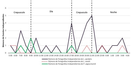 Con respecto a los patrones de actividad, L. pardalis es una especie que se encuentra activa durante todo el día, L. wiedii es una especie nocturna y H. yagouaroundi es una especie diurna. Probablemente este comportamiento está relacionado con la actividad de sus presas principales en el área (Aranda 2005a, b, c; Vanderhoff et al. 2011; Lira-Torres y Briones-Salas 2012). Por otro lado, la diferencia en los patrones de actividad de P. concolor y P. onca posiblemente sea una estrategia para evitar encuentros entre ellos (Foster et al. 2013), ya que se han reportado varios casos de especies simpátricas con hábitos alimentarios similares donde se ha visto este tipo de comportamiento, que aparentemente disminuye la competencia y permite la coexistencia de ambos (De Almeida et al. 2004). A pesar de que no se cuenta con suficientes registros fotográficos para corroborar este aspecto, estudios indican que para evitar competencia, P. concolor toma una amplia variedad de tamaños de presas y más especies pequeñas que P. onca (Rabinowitz y Nottingham 1986; Iriarte et al. 1990; Farrell et al. 2000). Sin embargo, a pesar de que pueda existir esta separación, y que P. onca tiende a tomar presas grandes (Jaksic et al. 1981), en bosques en donde las presas son pequeñas y escasas P. onca toma lo que encuentra en proporción a su disponibilidad (Emmons 1987).