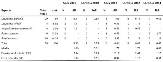 En este estudio se registraron cinco de las seis especies de felinos que se distribuyen en México y que se encuentran también en Norte y Sudamérica estas son: P. onca, P. concolor, L. pardalis, L. wiedii y H. yagouaroundi (Figura 2). De estas especies, P. onca, L. pardalis y L. wiedii se consideran en peligro de extinción de acuerdo a las normas mexicanas (NOM-059-SEMARNAT-2010, SEMARNAT 2010), además cuatro (P. onca, L. pardalis, L. wiedii y H. yagouaroundi) están en la lista roja de la IUCN o en CITES. Con excepción de L. pardalis, la mayoría de las especies registradas solo estuvieron presentes en dos temporadas de muestreo. Los datos de registros por especie y temporada de muestreo se proporcionan en la Tabla 1.