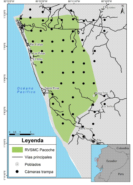 Adicionalmente al estudio de la biodiversidad en las áreas prístinas y los bosques primarios, también es importante estudiar cómo las especies de mamíferos grandes y medianos sobreviven en paisajes modificados por los humanos, para entender las adaptaciones que les permite tener esta tolerancia e identificar especies que ameritan acciones especiales de conservación (Cardillo et al. 2006; Dirzo et al. 2014). El Refugio de Vida Silvestre Marina y Costera Pacoche (RVSMCP) presenta las características idóneas para estudiar cómo los mamíferos se han adaptado al mosaico de hábitats presentes en la reserva. Aunque se trata de una zona protegida, diferentes actividades humanas se desarrollan dentro y alrededor de la reserva, las cuales incluyen la extracción de recursos (maderables y no maderables), caza de mamíferos pequeños y medianos, cultivos y ganadería.