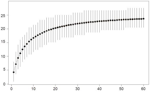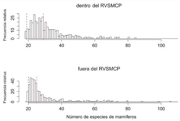 La curva de acumulación de especies para los 60 puntos de muestreo muestra que con 50 puntos se alcanza la mayoría de las especies muestreadas, 23 especies. El tamaño estimado de la comunidad de mamíferos (con una mediana de 26 especies y media de 27.65 especies), teniendo en cuenta que la detectabilidad de las especies de mamíferos con trampas cámara es imperfecta (Dorazio et al. 2006), resultó mayor que el número de especies observado. Al analizar los datos agrupándolos como dentro y fuera del RVSMCP, el tamaño esperado de la comunidad de mamíferos difiere significativamente (Figura 3).
