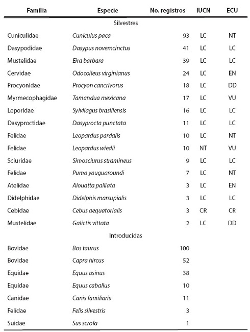 Las trampas cámara revelaron algunos registros interesantes como los monos Alouatta palliata y Cebus aequatorialis comiendo frutas en el suelo y el hurón Galictis vittata registrado en una cámara cercana a una quebrada. Para algunas especies como Eira barbara, Cuniculus paca y Dasypus novemcinctus se registraron más de 30 eventos y en más de cinco cámaras, mostrando ser abundantes. Mientras que para otras especies como Alouatta palliata, Cebus aequatorialis, Galictis vittata y Didelphis marsupialis se obtuvieron menos de tres registros (Tabla 1).