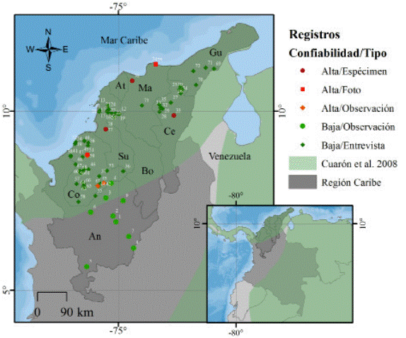 Los nuevos registros de distribución obtenidos, que incluyen en total 54 registros (48 de entrevistas, tres fotografías y tres observaciones; Figura 3) expanden la distribución conocida de la especie, de acuerdo con (Solari et al. 2013), a los departamentos de Córdoba, La Guajira y Cesar. Asimismo, esta nueva recopilación expande la distribución conocida en el Caribe colombiano y en el país, en aproximadamente 162 km lineales hacia el sur, y en aproximadamente 36,500 km2 (Figura 1).