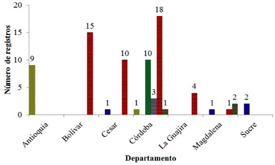 Área de estudio. La región Caribe colombiana se ubica en la porción norte del país. Colinda al oeste y al norte con el mar Caribe, y al este con Venezuela. La región incluye tradicionalmente siete unidades administrativas (departamentos): Atlántico, Bolívar, Cesar, Córdoba, La Guajira, Magdalena y Sucre. No obstante, para los fines del presente estudio, se incluyó el departamento de Antioquia, dada su amplia proporción, que corresponde a dicha región. A pesar de que geográficamente el departamento del Chocó incluye una pequeña parte dentro de la región, este departamento es tradicionalmente incluido como parte de la región Pacífico del país. Históricamente, la región ha sufrido un largo proceso de transformación. Allí, la mayoría del territorio ha sido utilizado en actividades productivas (González-Maya et al. 2013) y actualmente cuenta con pocos relictos de cobertura natural, la mayoría de los cuales están aislados.