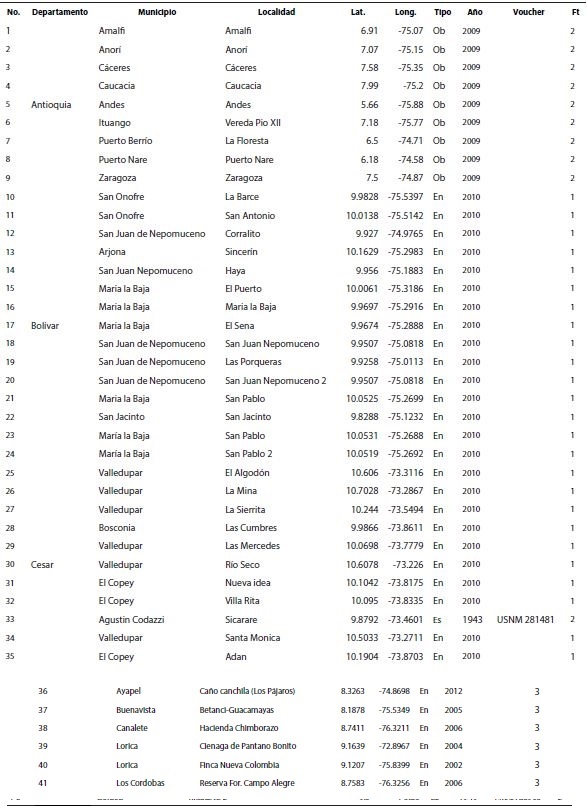 Métodos. Se buscó toda la información disponible de la especie en el país; se incluyó la consulta de colecciones de museos nacionales e internacionales en la plataforma en línea de The Global Biodiversity Information Facility (GBIF 2015), así como 97 centros de documentación del país, entre los que se encuentran Universidades, ONG y Corporaciones Autónomas Regionales. También se realizó una búsqueda general en internet. La búsqueda simple incluyó la revisión de todos los documentos que mencionan la especie en cualquiera de sus apartados.
