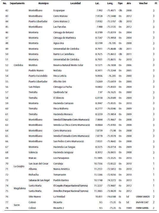 Dado el considerable vacío de conocimiento sobre la especie, esta nueva información aporta conocimiento sobre la distribución de la misma, y puede servir como base para análisis posteriores que involucren aspectos de su ecología y estado de conservación. Teniendo en cuenta los fuertes procesos de trasformación de los ecosistemas naturales en el país, y en especial en el Caribe colombiano (González-Maya et al. 2013), contar con información actualizada y completa de la distribución de las especies es fundamental como base para planificar su conservación.