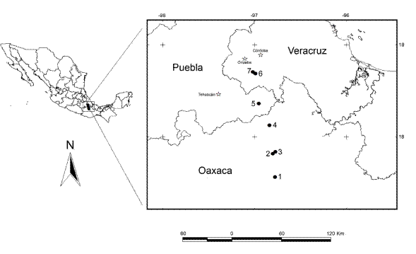 We conducted this study in seven sites along a mountain range that covers the states of Veracruz, Puebla, and Oaxaca, Mexico. These areas together constitute a portion of the Sierra Madre del Sur, one of the three main mountain ranges of Mexico. The main vegetation types present are coniferous forest and montane cloud forest.