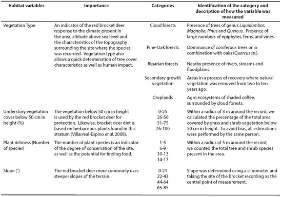 This work represents one of the few studies of red brocket deer habitat at a local scale in a mountain region in Mexico. There is an important and urgent need to increase the availability of data about the red brocket deer, especially considering its ecological importance and significant value to human populations. This information will help to develop the relevant conservation and management measures (such as, for example, the inclusion of some protection status under the Mexican Law) that contribute to maintaining healthy populations of the species.