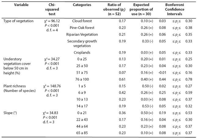 In order to perform the use-availability analysis, the four habitat variables were divided into four or five categories, depending on the characteristics of each variable (Table 1). We analyzed habitat use-availability by performing a chi-squared test with Bonferroni confidence intervals at 95 % (Neu et al. 1974; Byers et al. 1984).