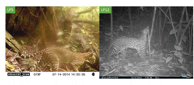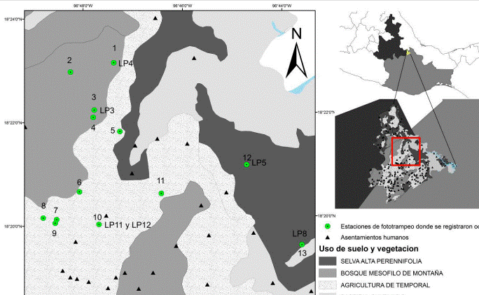 Abstract: Ocelots are at risk of extinction despite being a wide distribution species. Its presence in Puebla has been recorded, and also the possibility of existence of biological corridor to southeastern Mexico. Part of that corridor is located in the Sierra Negra in Puebla and the Sierra Mazateca in Oaxaca, where there are not previous studies that prove the presence of the ocelot. The Sierra Negra of Puebla and Sierra Mazateca of Oaxaca are contiguous mountain ranges with a mosaic of vegetation that includes tall evergreen forest, cloud forest, rain-fed agriculture and cultivated grasslands. We placed 11-18 camera trap stations spaced every 1-3 km, within a 110 km2 polygon, over three sampling periods. We also applied semistructured interviews to locals to obtain information on wild felids occurrence. Twelve individual ocelots were recorded in the study area, 10 of them through cameras and six through interviews. Ocelots were photographed in fragmented areas near human settlements. The six remaining ocelots registered were four skins, one carcass and one captive animal. Ocelots have been previously documented in disturbed landscapes and near human settlements areas. We believe that there is a resident ocelot population in the study area, thus the Sierra Negra and the Sierra Mazateca are an important component of the proposed biological corridor of the Sierra Madre Oriental.