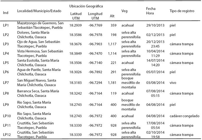 El ocelote (Leopardus pardalis) es una especie de amplia distribución en el Neotrópico, donde habita una gran variedad de ecosistemas, entre ellos los bosques tropicales y templados, manglares, matorral xerófilo y matorral desértico micrófilo (Aranda 2005; Martínez-Calderas et al. 2011; Ahumada-Carrillo et al. 2013; Aranda et al. 2014). No obstante, se encuentra en peligro de extinción debido al efecto de las actividades humanas, como la cacería y la destrucción y fragmentación de su hábitat (Caso et al. 2008; SEMARNAT 2010). La Convención sobre el Comercio Internacional de Especies Amenazadas de Fauna y Flora Silvestres (CITES, por sus siglas en inglés) lo incluye en el Apéndice I (CITES 2015) y la Unión Internacional para la Conservación de la Naturaleza y los Recursos Naturales (UICN, por sus siglas en inglés) lo clasifica como LC (least concern) o en "preocupación menor" (IUCN 2015). Su distribución histórica incluye la Sierra Madre Oriental (SMO; Aranda 2005), la cual se encuentra altamente modificada por las actividades antropogénicas (Arriaga et al. 2000). Se ha documentado su presencia en las selvas altas perennifolias del estado de Puebla (Hueytamalco y Plan de Guinea; Ramírez-Bravo et al. 2010) y Oaxaca (San Juan Teponaxtla y los Chimalapas), así como en la selva baja caducifolia (Tehuacán, Puebla; Ramírez-Bravo et al. 2010; Pérez-Irineo y Santos-Moreno 2014), por lo que se ha propuesto la existencia de un corredor biológico a lo largo de la SMO, el cual conecta con el sureste mexicano a través de los estados de Puebla, Veracruz y Oaxaca (Ramírez-Bravo et al. 2010). En dicha zona se ubican la Sierra Negra de Puebla y la Sierra Mazateca de Oaxaca; ambas sierras forman parte de la Región Terrestre Prioritaria 130 (RTP) "Sierras del norte de Oaxaca-Mixe". Esta sierra se caracteriza por mantener selvas altas perennifolias y bosques mesófilos de montaña, así como una alta riqueza de mamíferos y una alta concentración de especies en riesgo (Arriaga et al. 2000; García-Marmolejo et al. 2008). Esta región se considera con potencial para la distribución del ocelote y otros felinos tropicales, incluyendo al jaguar (Lorenzana 2011; Rodríguez-Soto et al. 2011, 2013; Dueñas-López et al. 2015). Sin embargo, no existen registros que corroboren la presencia del ocelote ni la de otros felinos silvestres en esta región en particular.