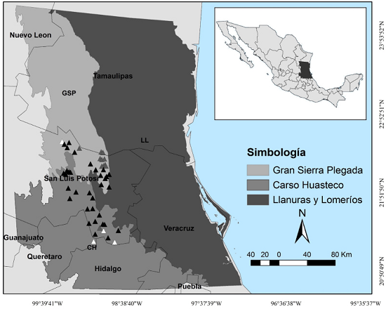 Study area. The study area partially covers two physiographic provinces (84,523 km2): Sierra Madre Oriental and Llanura Costera del Golfo Norte. In the first, it included part of the physiographic subprovinces Gran Sierra Plegada (GSP) and Carso Huasteco (CH). In the second, only the subprovince Llanuras y Lomerios (LL) was partially included (Figure 1). The characteristics of these subprovinces have great relevance in the landscape structure and degree of conservation. While in LL there is great antrophogenic impact throughout its surface due to topographic conditions, in CH, and mostly in GSP, large remnants of habitat remain in good condition. In this region, topography is flat to undulating towards the East and rough towards the West, with a wide range of climatic conditions from tropical to temperate, that varies from humid to semidry. There is a clear seasonal variation regarding precipitation, as well as a clear difference between the amount of rainfall in one region and the other. Altitude ranges from 0 to 2,300 m and precipitation from 600 to 2,500 mm.