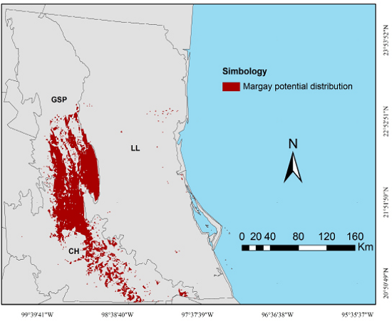 Today, the use of algorithms in the development of predictive and potential species distribution models has increased. Potential distribution is calculated from georeferenced observations and variables that act as predictors. Thanks to its predictive capacity and robustness in generating species distribution models, one of the most widely used algorithms is MaxEnt (Elith et al. 2006; Phillips et al. 2006). This algorithm generates distribution probabilities for the concerned species in a particular region, based on different variables that can be environmental (climate, vegetation type, topography), demographic or anthropogenic. It is constructed exclusively on current conditions present in the localities where the species occurs (Elith et al. 2006; Pearson et al. 2007). The software determines the distribution through the adjustment of the species occurrence probability in pixels throughout the study area. This is based on the idea that the best possible explanation for an unknown phenomenon maximizes the entropy or uncertainty of the distribution of the probability, depending on certain limitations. Concerning potential distribution models, they consist of values of those pixels in which the species has been detected (Phillips et al. 2004; Phillips et al. 2006). This study is part of a regional project on the ecology and conservation of wild felids in Mexico, and its purpose was to estimate the potential distribution of margays (Leopardus wiedii) in Northeastern Mexico.