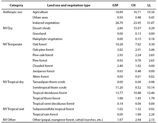 Anthropic land use is widespread within the study area for farming, agriculture and, in some regions, wood extraction (INEGI 2002a). The types of land use and vegetation are shown on Table 1. In this study there are 6 groups of native vegetation (NV) subdivided into 18 categories according to humidity and latitude gradients (Table 1). In GSP, the landscape corresponds to a mountainous karstic rock mass with irregular intermontane valleys, where anthropic use predominates (46.18 %). The native vegetation in GSP is dominated by tropical dry (26.99 %), followed by temperate (20.98 %) vegetation. Drier (2.86 %) and more humid tropical (1.02 %) types of vegetation are scarce. The landscape in CH is characterized by abrupt karstic mountains and intermontane valleys; anthropic use is 41.14 %, dominated by dry tropical (20.49 %) and dry (16.25 %) vegetation, followed by temperate vegetation (15.98 %). In LL, the terrain ranges from flat to undulated, where anthropic use is 50.86 % and dry tropical vegetation predominates (25.28 %), followed by temperate vegetation (18.08 %). Tropical humid (3.16 %) and dry (0.47 %) vegetation are scarce; other types of vegetation such as cattail marshes, palm forests, and riparian vegetation occupy 2.15 % of the landscape.