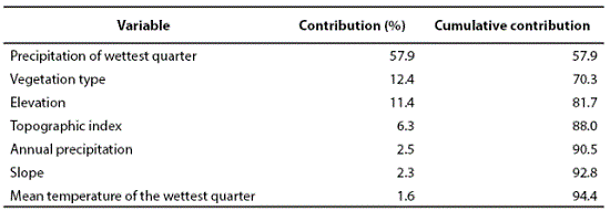 The margay was recorded in diverse environmental conditions within the study area, in locations varying from very humid to semidry environments (Appendix 1). Regarding temperature, this species inhabit from very hot to temperate, and in an altitude ranging from 6 to 1,800 m (INEGI 2002b; INEGI 2008; INEGI 2011). Seven predictive variables explained 94.4 % of the model, showing an AUC of 0.964 ± 0.0097, where an AUC value higher than 0.9 indicates an excellent model (Araujo and Guisan 2006). The four most relevant variables were: precipitation of the most humid quarter, vegetation type, and both altitude and topographic indexes. Each of the other three remaining variables did not account for more than 3 % of the total contribution (Table 2).