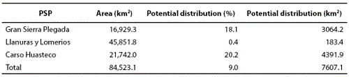 The potential distribution area of the margay in Northeastern Mexico covered approximately 9 % of the total studied landscape, with an area of 7,607 km2. GSP and CH subprovinces showed the highest distribution, with a potential presence of 18.1 and 20.2 % on each surface, respectively. Conversely, LL accounted for only 0.4 % (Table 3). The highest potential distribution continuity was observed in the contiguous mountainous areas between GSP and CH. In all of LL, we only found small and isolated patches due to fragmentation (Figure 2).