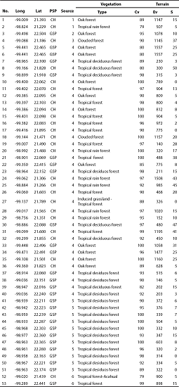 Information about margay records in Northeastern Mexico. Source of records: Historic records: 1. Louisiana State university Museum of Zoology (LSUMZ), 2. Colección de Mastozoología del ENCB-IPN, 3. Colección de Mamíferos del Museo de Zoología Alfonso L. Herrera. Facultad de Ciencias, UNAM (MZFC-UNAM). Records from literature: 4. Are of Martínez-Calderas et al. 2012. Field work and surveys: 5. Camera traps and 6. Tracks and signs. Longitude = Long, Latitude = Lat, % of vegetation cover = Cv, elevation in meters = Ev, degree of slope =S. PSP = physiographic subprovinces: CH = Carso Huasteco, GSP = Gran Sierra Plegada.