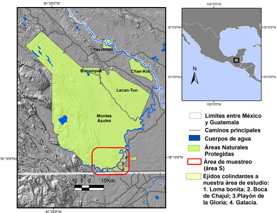 El área de muestreo se localiza en el sur de la Selva Lacandona, en el borde sur de la Reserva de la Biosfera Montes Azules, dentro de la zona de uso restringido de la reserva (INE-SEMARNAP 2000). Se encuentra aislada de los ejidos colindantes (Loma Bonita, Boca de Chajul, Playón de la Gloria y Galacia) por el río Lacantún (Figura 1). La vegetación dominante en este sitio es selva alta perennifolia bien conservada (de la Torre y Medellín 2011).