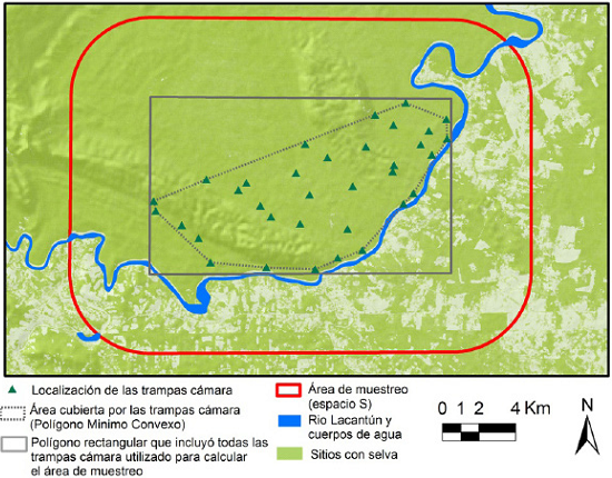 La mayor parte de la información publicada sobre el ocelote en México consiste en registros de su distribución (Pozo de la Tijera y Escobedo Cabrera 1999; Grigione et al. 2001; Sanchez et al. 2002; Servín et al. 2003; Lorenzana et al. 2004; Iglesias et al. 2008; Bárcenas y Medellín 2010; Ramirez-Bravo et al. 2010; Martínez-Calderas et al. 2011; Aranda et al. 2012; Ahumada-Carrillo et al. 2013; Hernández-Flores et al. 2013; Sánchez Hernández et al. 2013; Galindo-Aguilar et al. 2016; García-Bastida et al. 2016). Aunque también hay algunos estudios sobre su historia natural los cuales han contribuido al conocimiento de sus hábitos alimenticios (de Villa et al. 1995), y patrones de actividad (Pérez-Irineo y Santos-Moreno 2014; Briones-Salas et al. 2016). A pesar de que se han publicado varios estudios acerca de la densidad de esta especie a lo largo de su intervalo de distribución (Trolle y Kéry 2003; 2005; Maffei et al. 2005; Di Bitetti et al. 2006; 2008; Dillon y Kelly 2007; Salvador y Espinosa 2015), se tiene muy poca información acerca de las densidades de esta especie para México (Pérez-Irineo y Santos-Moreno 2014; Martínez-Hernández et al. 2015). El objetivo de este estudio es estimar la densidad poblacional de los ocelotes en la región de la Selva Lacandona, en el estado de Chiapas, a partir del uso de trampas-cámara y de modelos espacialmente explícitos de captura-recaptura. Adicionalmente, describimos los patrones de actividad de los ocelotes en diferentes periodos del día utilizando los registros obtenidos mediante las trampas-cámara y comparamos los resultados obtenidos con otros estudios publicados para México y otras regiones del Neotrópico.