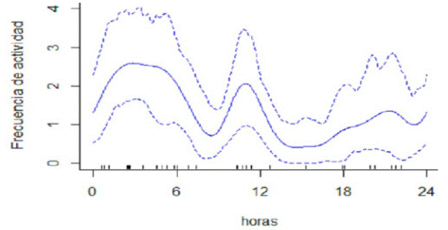 Análisis de los patrones de actividad. El patrón de actividad de los ocelotes se infirió por medio de la hora que registran las fotografías, debido a que las trampas-cámaras estuvieron activas durante todo el día. Se utilizaron todos los datos para la obtención de estos patrones, así como las fotografías que se obtuvieron de ambos sexos. Se agruparon las fotografías en intervalos de una hora durante las 24 horas del día. El análisis de los patrones de actividad se hizo utilizando el programa"Activity"(Rowcliffe 2015 - disponible en https://cran.r-project.org/web/packages/activity/index.html), para R 3.0.1 (2007; The R Foundation for Statistical Computing).